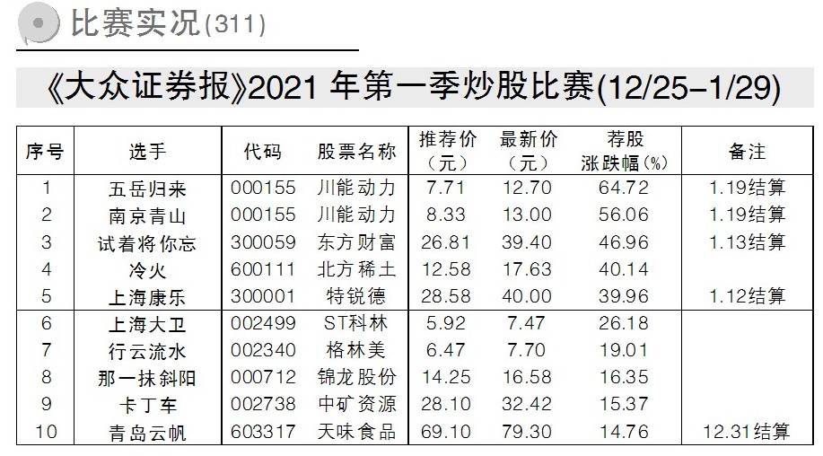 《大眾證券報》2021年第一季炒股大賽中,選手“五岳歸來”以7.71元/股推薦的川能動力,薦股漲幅64.72%榮獲冠軍。選手“南京青山”以8.33元/股也推薦的川能動力,薦股漲幅56.06%榮獲亞軍。選手“試著將你忘”以26.81元/股推薦的東方財富,薦股漲幅46.96%位列第三。