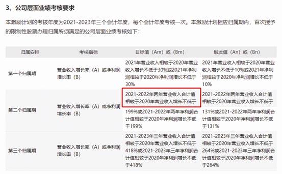 在考核要求中:“2021-2022年兩年營業收入合計值相較于2020年營業收入增長不低于199%或2021-2022年兩年凈利潤合計值相較于2020年凈利潤增長不低于199%”。(見圖2)