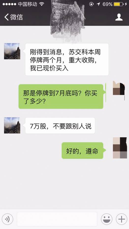 時(shí)光倒回至2016年8月份,“蔡方工作室”記者接到L女士的舉報(bào),其舉報(bào)蘇交科檢測(cè)院副院長(zhǎng)楊揚(yáng)涉嫌內(nèi)幕交易,提供了包括身份證號(hào)、手機(jī)號(hào)碼、微信號(hào)、家庭住址等自然信息和其四次涉嫌內(nèi)幕交易的操作情況。最后一次交易是,2016年5月17日,楊揚(yáng)獲悉蘇交科股票將于一周內(nèi)停牌后,買入約9萬股。并且把這個(gè)消息很明確的在微信里傳遞給了別人,微信內(nèi)容是:“剛剛得到消息,蘇交科一周內(nèi)停牌,兩月,我已現(xiàn)價(jià)買入?!?/p>