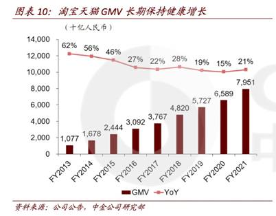 根據阿里的公開數據來看,淘寶天貓年消費7千元以下的消費者約5.5億人,中金測算,淘寶天貓有近2億消費者年均消費約2.1-2.5萬元,這部分消費者貢獻了4.2-4.6萬億元GMV,約占淘寶天貓成交額的2/3。受益于阿里多年來在消費升級路線的價值主張,這部分核心用戶基本盤很難被其他渠道所動搖。