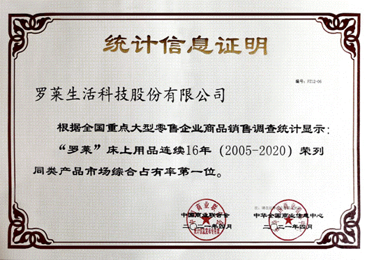 2021年4月22日,中國商業(yè)聯(lián)合會、中華全國商業(yè)信息中心聯(lián)合召開“2021(第二十九屆)中國市場商品銷售統(tǒng)計結(jié)果新聞發(fā)布會”;會議發(fā)布了2020年度中國市場商品銷售部分領(lǐng)先品牌。根據(jù)全國大型零售企業(yè)商品銷售調(diào)查統(tǒng)計,“羅萊”床上用品連續(xù)16年榮列同類產(chǎn)品市場綜合占有率第一位。