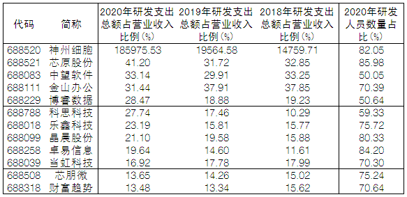 根據(jù)Wind數(shù)據(jù)統(tǒng)計,以2018年、2019年、2020年連續(xù)三年研發(fā)支出總額占營業(yè)額超過10%,且2020年研發(fā)人員數(shù)量占比超過50%為標(biāo)準(zhǔn),共計有12家公司“含科量”較高。記者 劉揚(yáng)