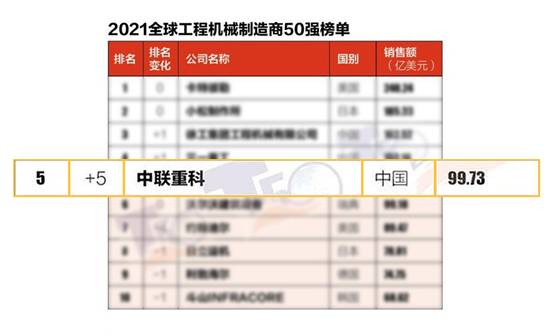 △中聯重科榮登2021全球工程機械制造商50強榜單第5名