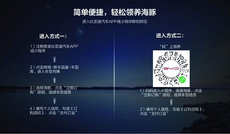 海豚是比亞迪首款全面開啟線上預(yù)定和銷售模式的車型,掃碼進入比亞迪汽車APP或小程序,指點間就能完成車輛預(yù)訂,像網(wǎng)購一樣方便。完成訂金支付的用戶,還可以線上實時查詢專屬自己的車輛交付狀態(tài)信息。