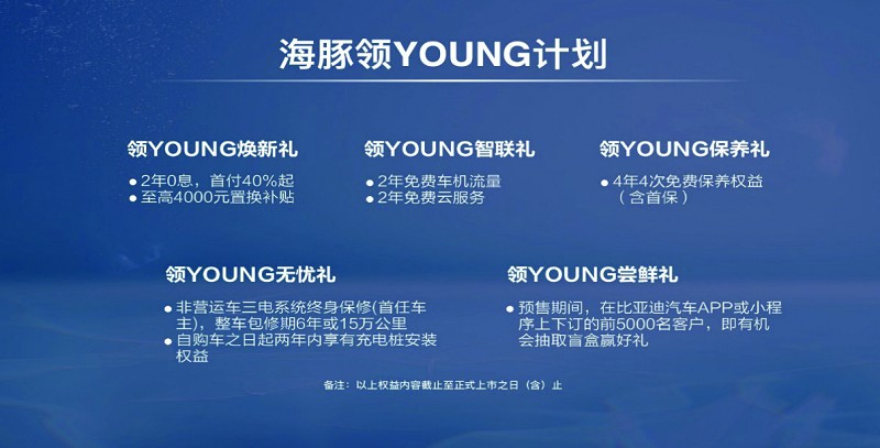 為了減輕年輕用戶的購車壓力,為首批海豚用戶提供更多福利,比亞迪特別推出 “海豚領(lǐng)YOUNG計劃”。自預(yù)售開啟之日起,截止至海豚正式上市當日(含),預(yù)訂海豚的用戶可享受包括“2年0息,首付40%起”“至高4000元置換補貼”在內(nèi)的多重權(quán)益大禮,通過比亞迪汽車APP或小程序下訂的前5000名客戶,更有機會抽取盲盒贏好禮。