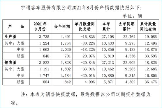 9月3日晚,宇通客車(600066.SH)發(fā)布2021年8月份產(chǎn)銷數(shù)據(jù)快報(bào)顯示,8月份,宇通累計(jì)銷售客車3822輛,同比下滑20.84%;今年前8個(gè)月,宇通累計(jì)銷售客車27213輛,同比增長(zhǎng)18.82%。