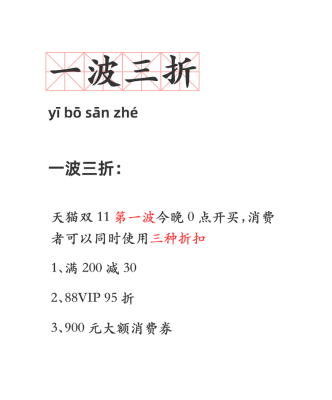 在今晚的第一波售賣期,消費(fèi)者可以買買買、付尾款,同時(shí)使用3種折扣:滿200減30、88VIP領(lǐng)900元大額消費(fèi)券、再疊加95折。網(wǎng)友調(diào)侃:“真是一波三折!”