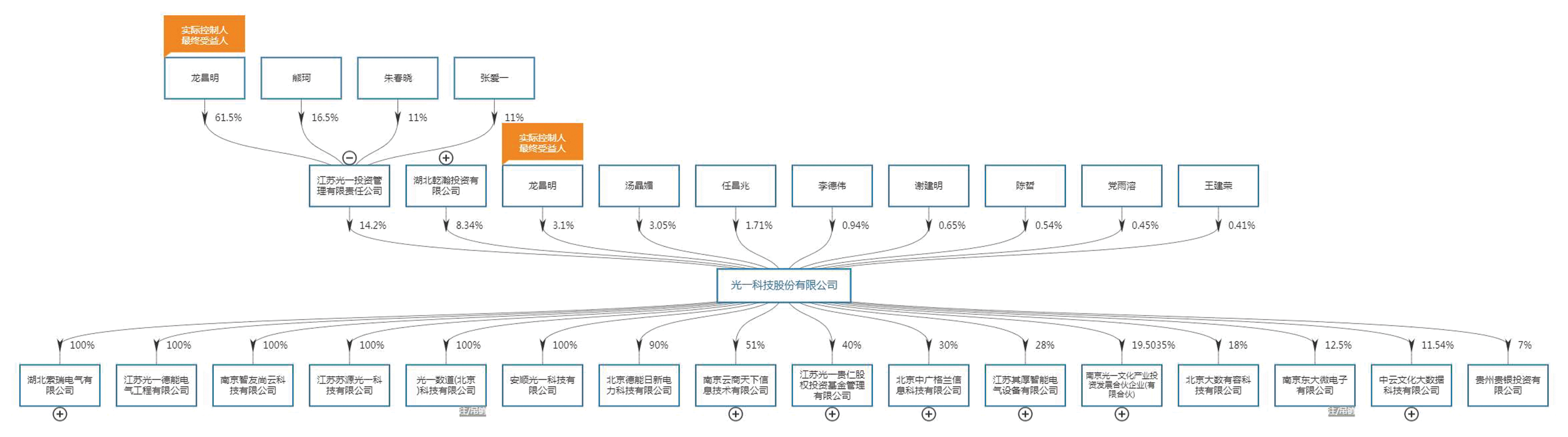 記者查詢Wind發現,股權穿透后,龍昌明持有光一投資61.5%股份(圖)。數據顯示,光一投資及龍昌明所持股份共計7053.52萬股,占光一科技總股本的17.30%,均處于凍結狀態,占其持股數量的100%,存在司法拍賣的風險。