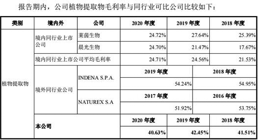 嘉禾生物《招股說明書》將萊茵生物、晨光生物列為境內同行業上市公司,數據顯示,這兩家公司2018年至2020年平均毛利率分別為21.53%、24.56%、24.71%。而同期嘉禾生物對應毛利率分別為41.51%、42.45%、40.63%,分別高出同行19.98、17.89、15.92個百分點(如圖2)。