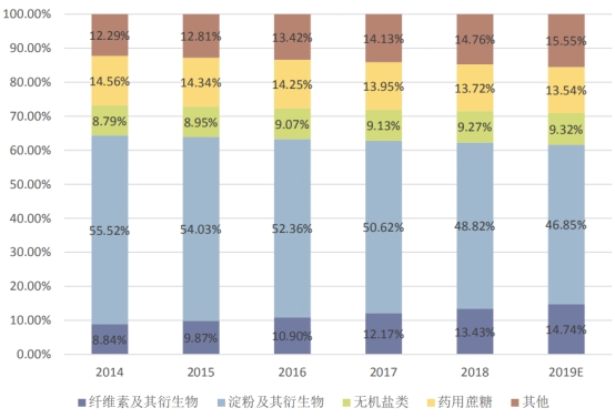 根據(jù)API China發(fā)布的文章《國內(nèi)藥用輔料發(fā)展前景分析》,從產(chǎn)品種類來看,國內(nèi)藥用輔料中淀粉及其衍生物產(chǎn)量占比最大,接近50%,其次是藥用蔗糖和纖維素類,二者分別為14%左右。