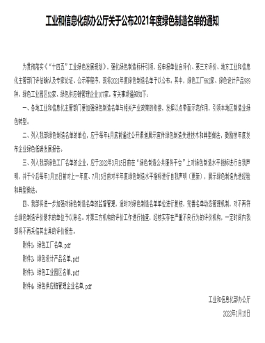 近日,在工業(yè)和信息化部辦公廳關(guān)于公布2021年度綠色制造名單的通知中,通達(dá)股份(002560.SZ)成功入選2021年度國(guó)家級(jí)綠色工廠。