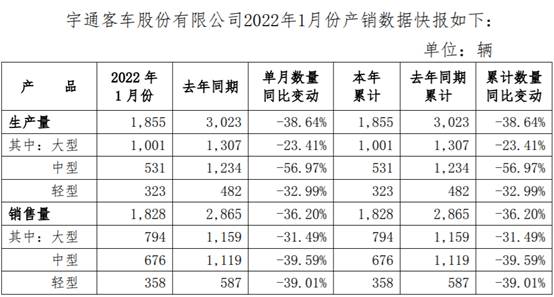 2月8日,宇通客車(600066.SH)發布2022年1月份產銷數據快報顯示,1月份,宇通客車銷量為1828輛,其中,大型、中型、輕型客車銷量分別為794輛、676輛、358輛。