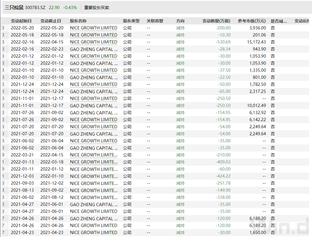 在公司創立10周年之際,三只松鼠等來的不光是股民的調侃,還有被資本的拋棄。2020年9月以來,除了創始人章燎源外,以IDG資本旗下子公司NICE GROWTH LIMITED為代表的另外三大股東紛紛選擇減持套現,Wind數據顯示,期間,其通過50余次減持動作累計套現十余億元。