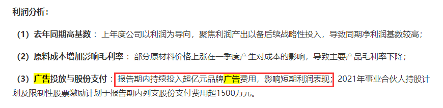 影響凈利潤更重要的因素則是公司的“后續戰略性投入”——打廣告。報告期內,三只松鼠持續投入超億元品牌廣告費用,直接影響了公司短期利潤的表現。