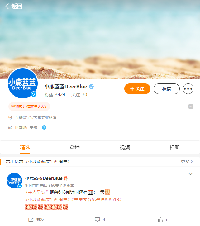 相比之下,小鹿藍藍的成績斐然,2021年錄得4.92億元營收,坐穩了公司第二品牌的位置。但是,其品牌影響力想要追上老大哥三只松鼠還要花點心思和時間。微博平臺上,三只松鼠的粉絲數為123萬,小鹿藍藍的粉絲數卻僅有3424人。