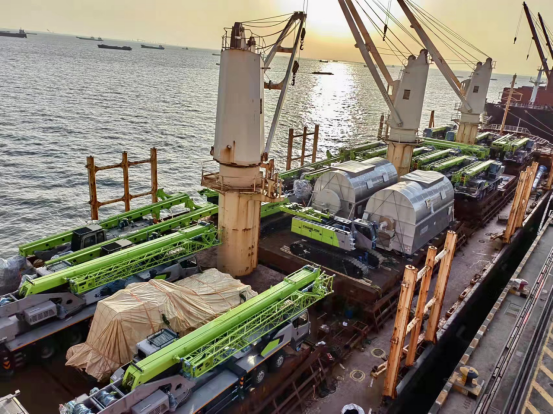 △已裝運(yùn)上船的中聯(lián)重科土方機(jī)械、起重機(jī)械等各類設(shè)備