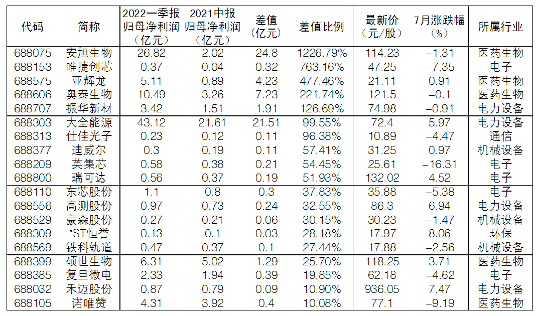 記者以今年一季度、去年中報歸母凈利均大于0,一季報歸母凈利大于去年中報歸母凈利且差值比例大于10%,同時尚未披露中報預告為標準,通過Wind統計篩選出19只科創板公司中報預增概率較大。