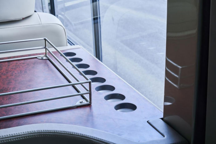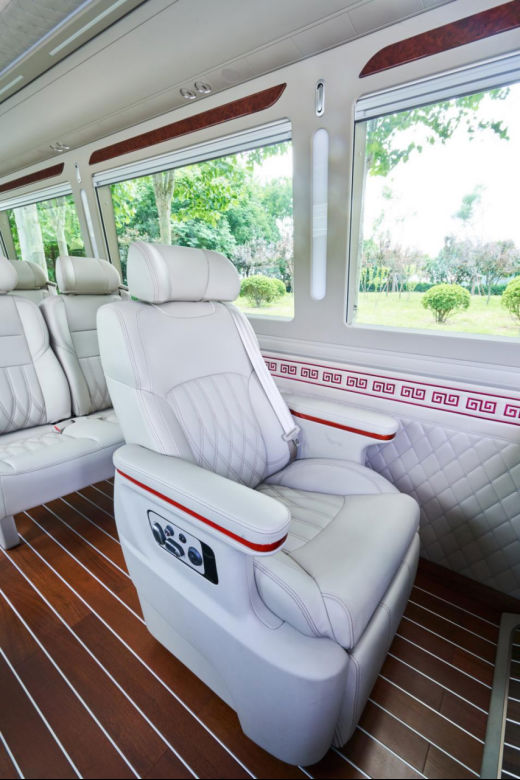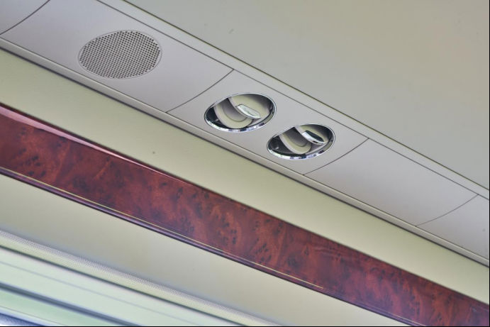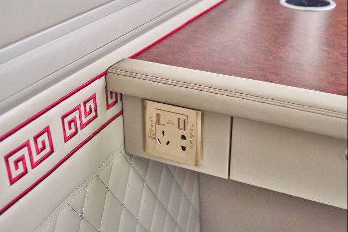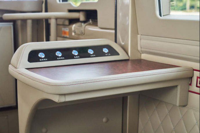 靠近車門的座椅位置是為秘書或助理而留,方便他們最后上車、最先下車。同時還放置一個設置有集中控制系統的木紋書桌,可以控制車內燈光、空調等設施,方便為車內人員提供及時的服務,也可以隨時在上面辦公。