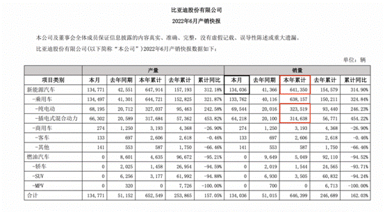 數(shù)據(jù)顯示,6月份,比亞迪銷(xiāo)售新能源汽車(chē)13.4萬(wàn)輛,同比增長(zhǎng)224.02%,環(huán)比增長(zhǎng)16.61%;1-6月份,比亞迪累計(jì)銷(xiāo)售新能源汽車(chē)64.1萬(wàn)輛,累計(jì)同比增長(zhǎng)314.90%。從產(chǎn)品結(jié)構(gòu)上看,1-6月份比亞迪純電車(chē)型和插混車(chē)型乘用車(chē)分別累計(jì)銷(xiāo)售約32.4萬(wàn)輛、31.5萬(wàn)輛,占比分別為50.70%和49.30%,分別同比增長(zhǎng)246.23%、454.22%。