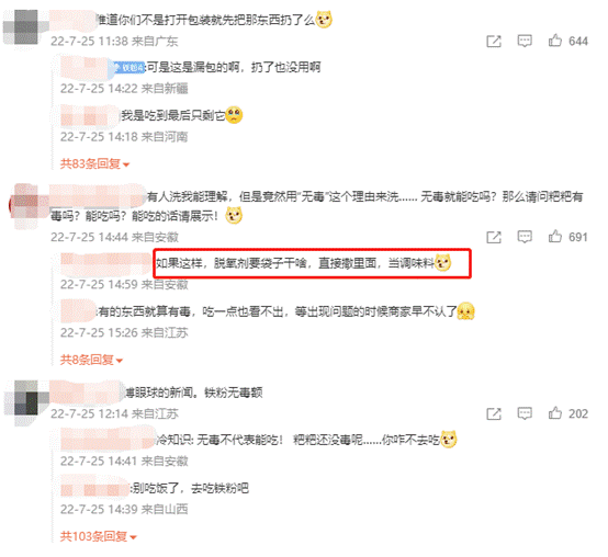 “最煩商家這種說辭,無毒、對(duì)身體無害,誤食會(huì)排出體外,那你每天是不是也吃二兩呀!”“如果這樣,脫氧劑要袋子干啥?直接撒里面,當(dāng)調(diào)味料!”網(wǎng)友對(duì)于這樣的回答顯然難以接受。