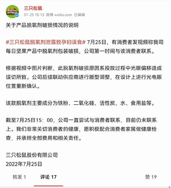 7月25日,有消費(fèi)者爆料稱購買的三只松鼠每日?qǐng)?jiān)果產(chǎn)品中脫氧劑包裝破損,而發(fā)現(xiàn)該問題之時(shí),其尚在孕期的妻子已經(jīng)食用了半包。該消費(fèi)者旋即打開另一袋商品,竟然發(fā)現(xiàn)了同樣的問題。