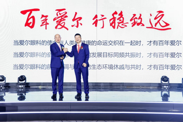 愛爾眼科醫(yī)院集團董事長陳邦(左)和全球總裁李力(右)在20周年慶典上作主題演講