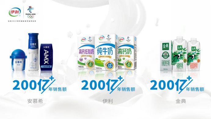 具體來看,通過持續的產品與技術創新,伊利傳統優勢業務液態奶、冷飲在2021年分別實現營業收入849.11億元、71.61億元,同比分別增長11.54%、16.28%,均穩居市場第一,保持絕對領先地位。其中“伊利”、“金典”、“安慕希”系列產品年銷售規模均超過200億元,成為當之無愧的“國民品牌”產品。