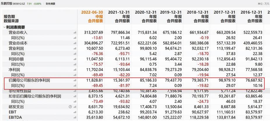 最新披露的2022年中報顯示,東鵬控股實現營業收入31.32億元,同比減少13.61%,凈利潤1.18億元,同比減少69.51%,扣非后凈利潤0.84億元,同比減少73.42%。短期公司受需求下滑及成本增加影響業績出現下滑。