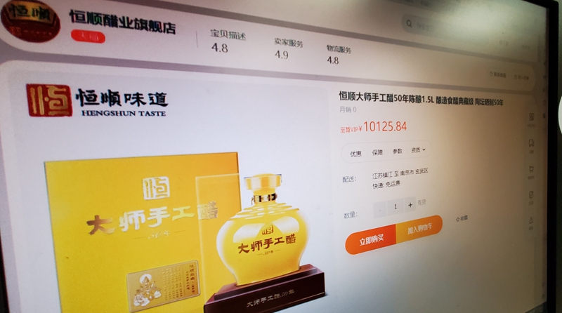 恒順醋業在醋上的探索不可謂不多。不久前,公司在其天貓平臺“恒順醋業旗艦店”中,上架了一款售價10888元,名為“大師手工醋50年陳釀”的產品,引發市場關注。