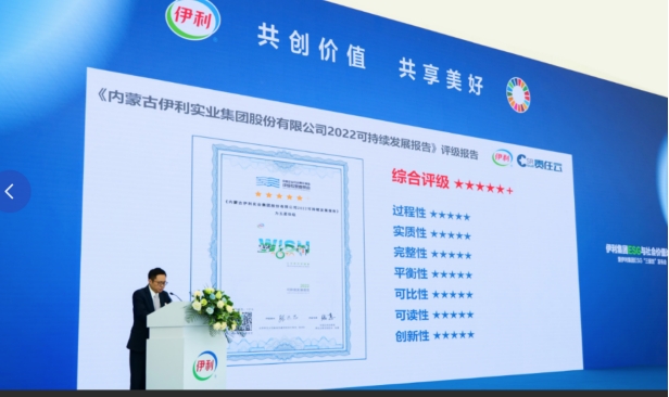 伊利《2022可持續發展報告》甫一發布,就獲得了中國企業社會責任報告評級專家委員會“五星佳”評價。鐘宏武在發布會上宣布,經過評級專家組對《2022可持續發展報告》從過程性、實質性、完整性、平衡性、可比性、可讀性、創新性七個方面的綜合評價,評級結果為“五星佳”級。