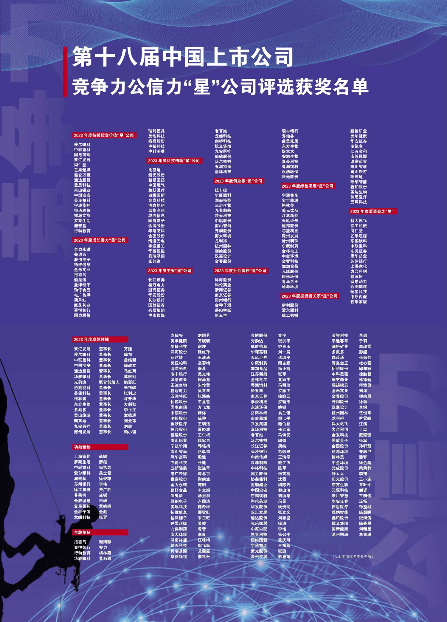 評選結果顯示,160家上市公司分別榮獲“持續投資價值‘星’公司”、“成長潛力‘星’公司”、“社會責任‘星’公司”等獎項;16家上市公司掌門人獲得“上市公司卓越領袖”榮譽,12家上市公司董秘獲得“上市公司功勛董秘”榮譽、123家上市公司董秘獲得“投資者關系金牌董秘”榮譽。