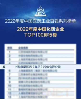 復星醫藥榮登2022年度中國化藥企業百強榜第6位
