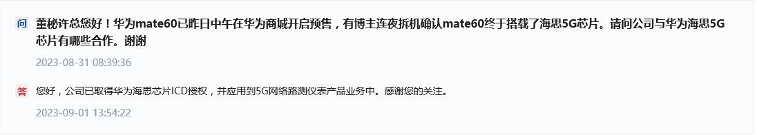 8月31日早間,有投資者在深交所互動平臺向世紀鼎利提問:“公司與華為海思5G芯片有哪些合作?”公司于1日下午13:54回復稱:“公司已取得華為海思芯片ICD授權,并應用到5G網(wǎng)絡路測儀表產(chǎn)品業(yè)務中。”