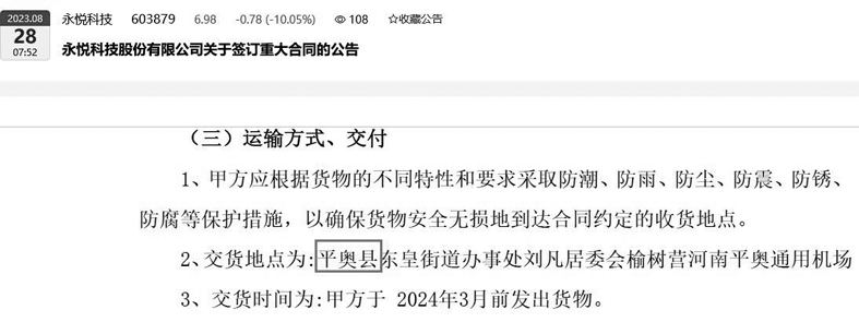 8月28日,永悅科技披露公告稱,全資子公司永悅智能與平輿縣暢達交投簽訂《銷售合同》,合同總金額為3億元,合同標的為5000臺無人機。根據(jù)合同約定,永悅智能需于2024年3月前發(fā)出貨物。