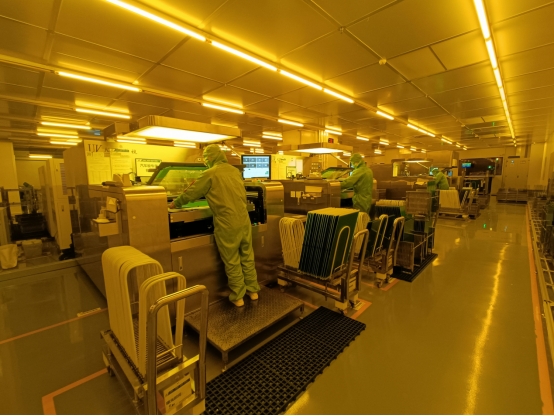 在這層的生產(chǎn)區(qū)域內(nèi),有兩道工序的生產(chǎn)車間格外與眾不同——除了運轉(zhuǎn)著的機器,房間里還有不少穿著防塵服以及制服的工作人員忙碌地穿梭著。