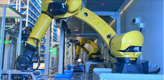 通過(guò)監(jiān)控,記者看到,兩臺(tái)機(jī)械手臂不斷抓取大小不同的瓶身,經(jīng)過(guò)稱重、擰瓶蓋等操作后,再分裝至由不同圓孔排列而成的周轉(zhuǎn)箱內(nèi),最后經(jīng)AGV運(yùn)輸車(chē)送至不同的貨架上。