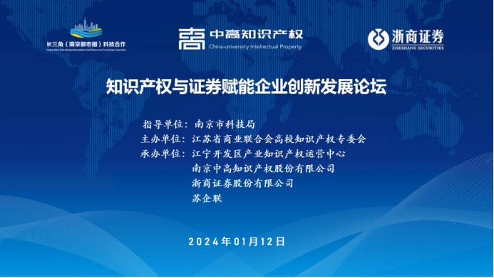 為深入貫徹落實習近平總書記關于“著力在推動企業創新上下功夫,加強知識產權保護,激發涌現更多專精特新中小企業”的重要指示和黨的二十大精神,2024年1月12日,在南京市科技局的指導下,江蘇省商業聯合會、江寧開發區產業知識產權運營中心、南京中高知識產權股份有限公司、浙商證券股份有限公司、蘇企聯共同舉辦“知識產權與證券賦能企業創新發展”論壇活動,助力企業發展提質增效。