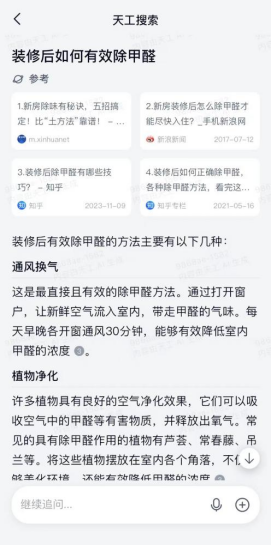 (天工AI搜索的答案集成、追問、溯源等功能)