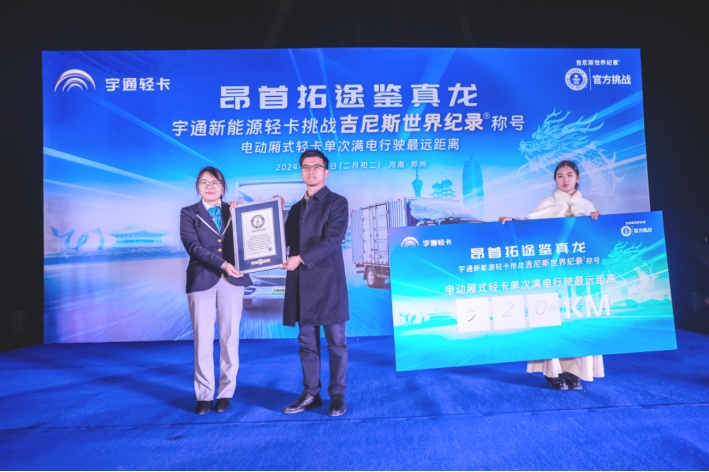 【宇通新能源輕卡獲得“電動廂式輕卡單次滿電行駛最遠距離”的吉尼斯世界紀錄稱號】