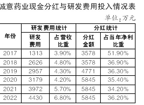 記者了解到,上市前三年,誠意藥業每年分紅在3500萬元至4700萬元之間;上市后三年,公司每年分紅接近6000萬元。此外,公司還進行了4次資本公積轉增股本,每次均為10送4,公司股本也從8520萬元增加到32730.432萬元,體現了業績增厚之后回報投資者的力度也在同步增長。同時,公司最近三年研發投入金額累計達1.16億元,研發投入占營業收入比例為5.5%,“創新驅動”成為增厚業績的主動力。