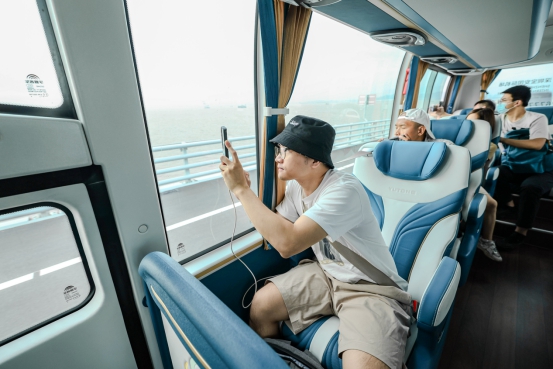 在開通儀式上,由各部委單位、各行業(yè)領(lǐng)袖、社會人士組建的首航體驗團也乘坐宇通高端新能源客車,感受著“世紀(jì)工程+高端巴士”雙重BUFF疊加所帶來的全新出行體驗。作為該線路的首航承運者,宇通C11E 2+1座椅青山碧水款給乘客增添了一番“享受”與別樣的出行體驗,收獲了“陸上商務(wù)艙”“高端出行標(biāo)桿”等贊譽。