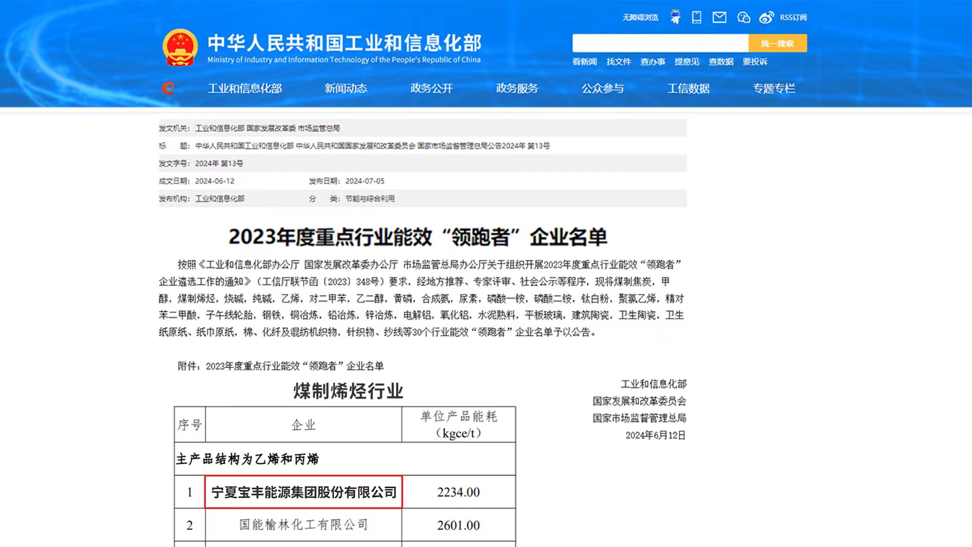 7月5日,工業和信息化部公布了2023年度國家級重點行業能效“領跑者”企業名單,寶豐能源光榮上榜,在煤制烯烴行業排行榜中,能耗水平最低,位列第一,榮獲國家級煤制烯烴行業能效“領跑者”,這不僅是對寶豐能源卓越能效管理與綠色低碳發展的高度肯定,更是其作為行業領軍企業的又一力證。