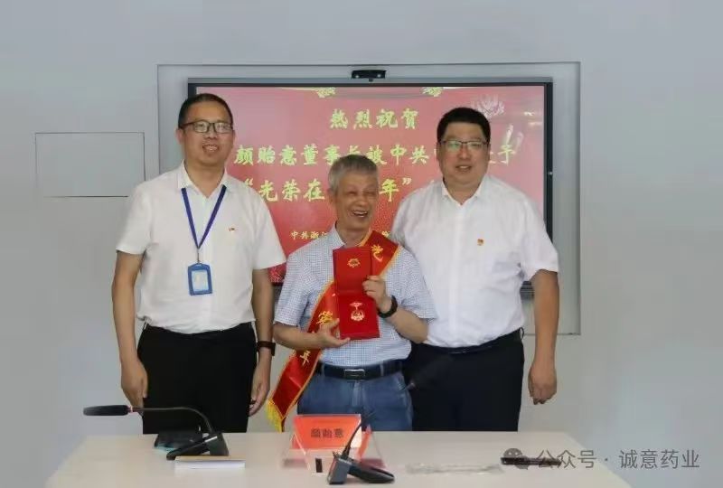 2024年8月15日下午,誠意藥業黨委舉行隆重的儀式:現任黨委書記、總經理趙春建率黨委班子成員、部分黨員為“光榮在黨50年”的顏貽意董事長披上綬帶、頒發紀念章,代表上級黨委向光榮在黨50年的顏貽意同志表示熱烈的祝賀和誠摯的慰問。