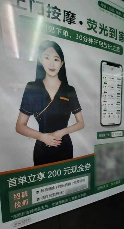 分眾傳媒的客戶中,“上門按摩”企業(yè)發(fā)布的廣告更是引發(fā)爭議。記者觀察到,2023年下半年開始,除了最具話題性的“東郊到家”,在南京多個小區(qū)的分眾傳媒電梯海報廣告中,還曾出現(xiàn)過往約、熒光到家等多個上門按摩平臺的廣告。