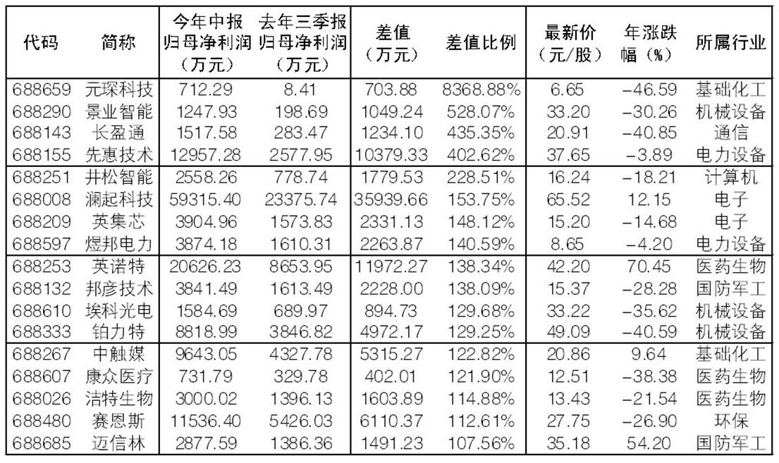 記者以今年中報、去年三季報歸母凈利均大于0,今年中報歸母凈利大于去年三季報歸母凈利且差值比例大于100%,同時尚未披露預告為標準,通過Wind數據統計篩選出17只科創板公司三季報預增概率較大(見表)。