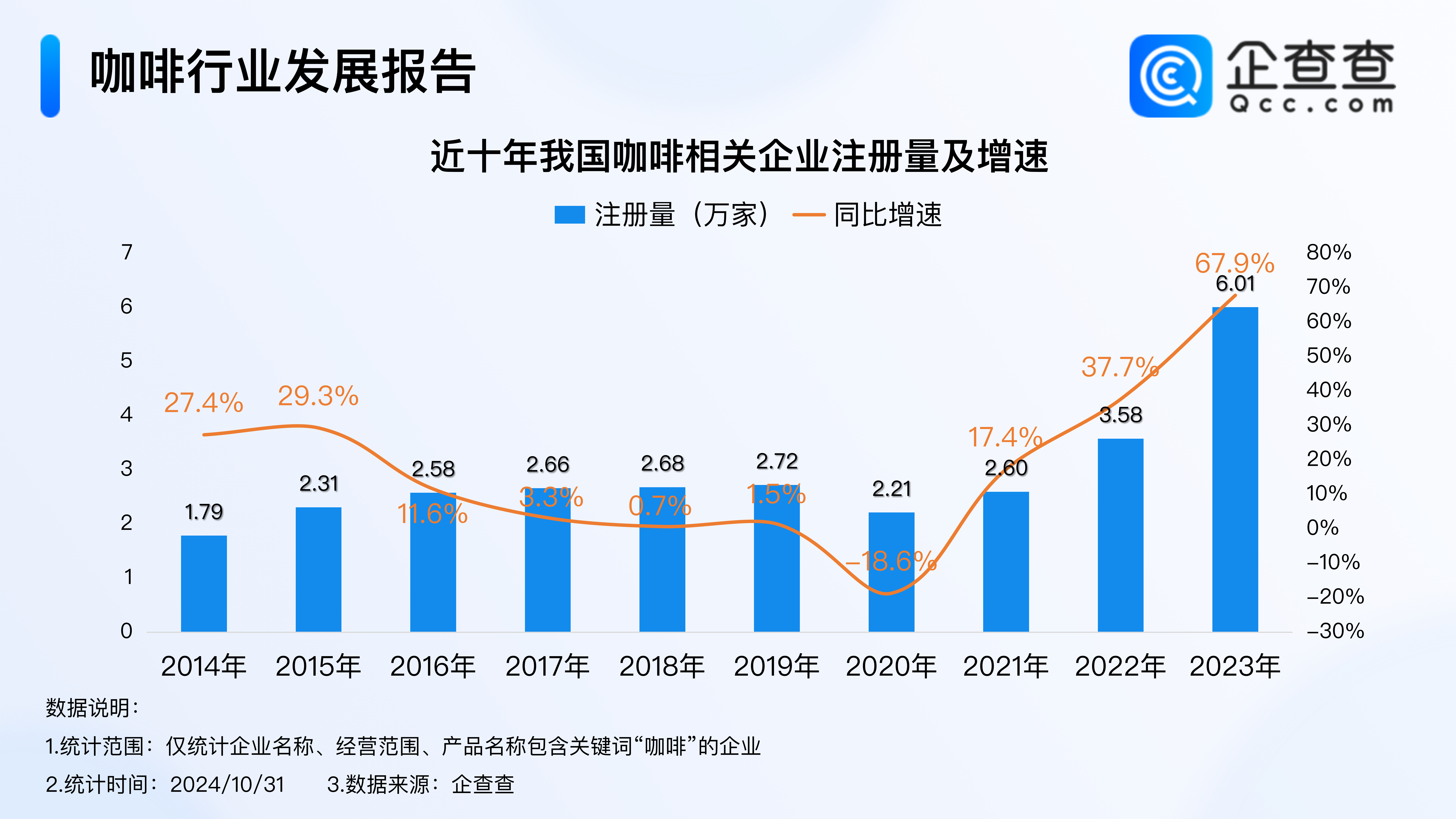 企查查數據顯示,2014年至2019年,我國咖啡相關企業注冊量逐年增加,2019年全年注冊2.72萬家咖啡相關企業;2021年開始,咖啡市場需求快速釋放,相關企業注冊量增速逐年走高,2023年,我國咖啡相關企業注冊量首次突破5萬家,全年注冊6.01萬家,同比增加67.9%。截至10月31日,2024年我國已注冊3.8萬家咖啡相關企業。