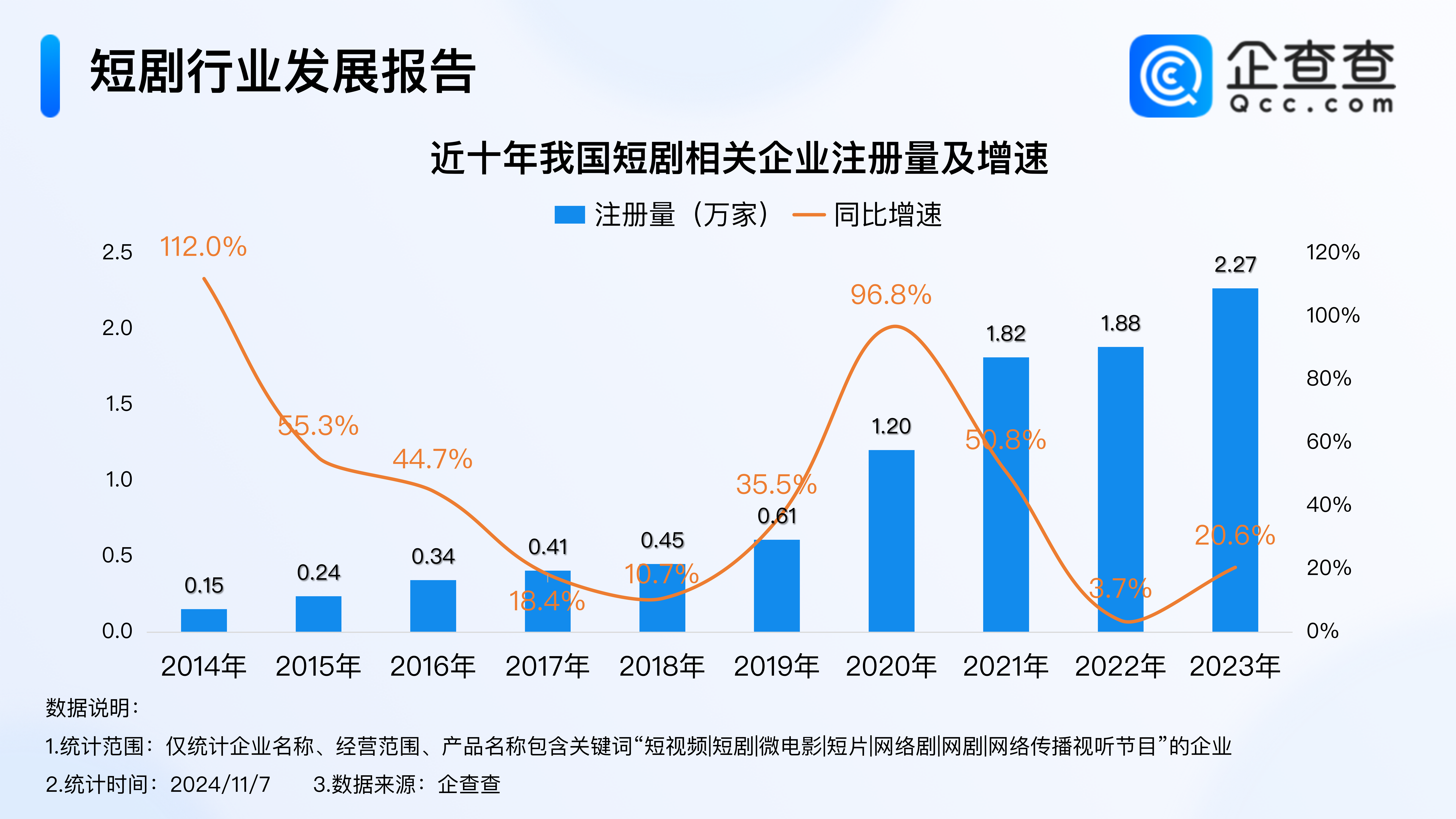 企查查數據顯示,近十年,我國短劇相關企業注冊量逐年走高,其中2020年注冊量首次突破1萬家,全年注冊量同比大幅增加96.8%至1.20萬家,2023年注冊量首次突破2萬家,全年注冊量同比增加20.6%至2.27萬家。截至11月7日,2024年我國已注冊1.61萬家短劇相關企業。