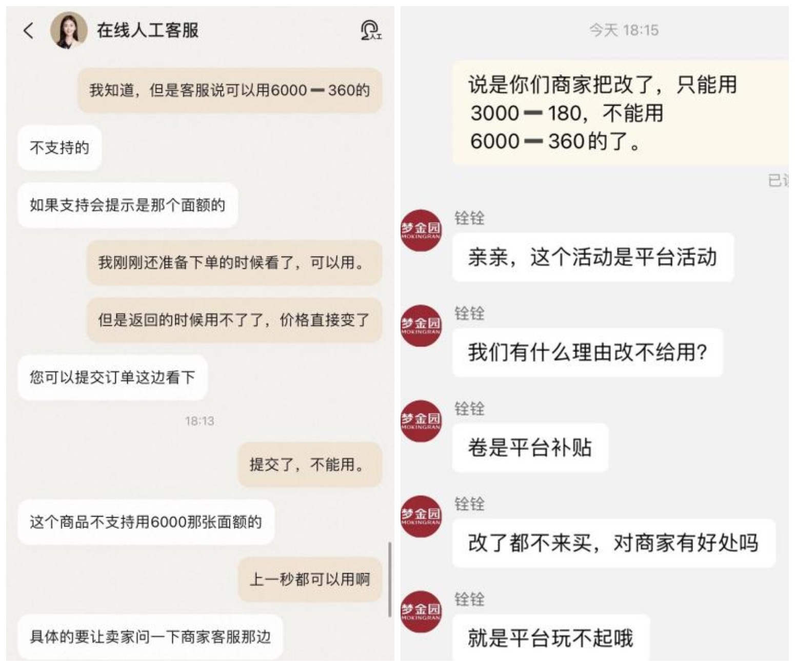 隨后該消費(fèi)者向淘寶平臺以及“夢金園”商家的客服反映前述情況,而淘寶客服回復(fù)稱是此商品不支持使用相關(guān)購物券,并讓消費(fèi)者“問一下商家客服那邊”;“夢金園”店鋪的客服卻表示“是平臺玩不起”,堅(jiān)稱是淘寶平臺不給使用該購物券。