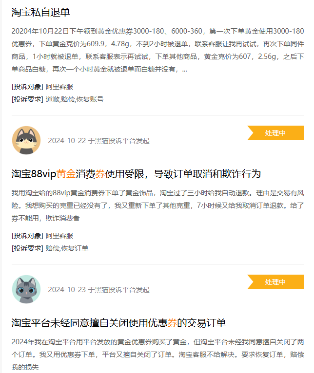 與此同時,黑貓投訴平臺上,還有消費(fèi)者反映稱,“雙十一”期間在“夢金園”店鋪使用黃金購物券下單后,被無故強(qiáng)制性退單。除了“夢金園”店鋪,其他店鋪也有類似情況,在“雙十一”期間,多名消費(fèi)者接連投訴領(lǐng)取的黃金品類購物券無法正常使用,或是使用該購物券下單后卻被店鋪無故退單的情況。