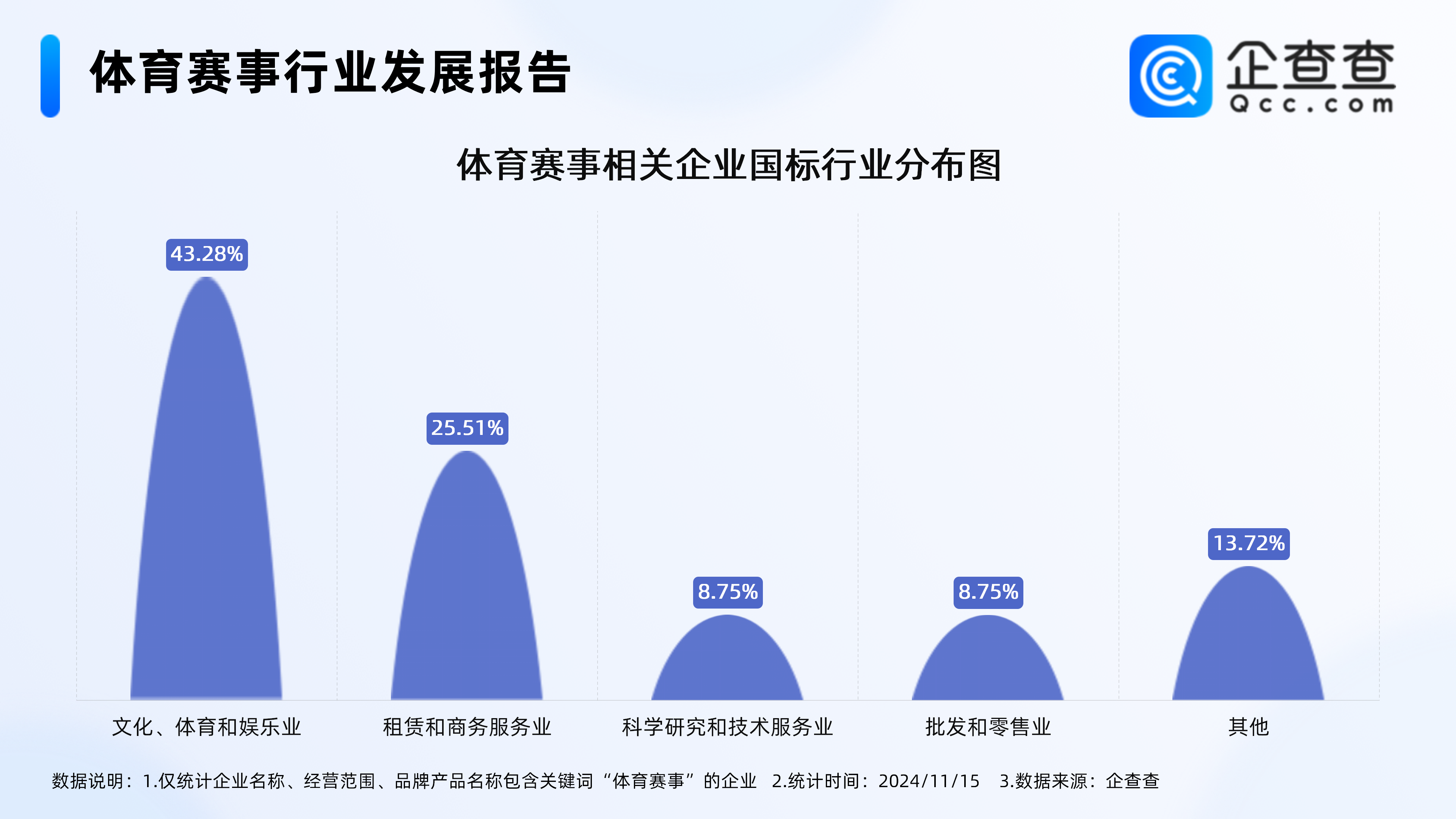 企查查數(shù)據(jù)顯示,體育賽事相關(guān)現(xiàn)存企業(yè)主要分布在文化、體育和娛樂業(yè)以及租賃和商務(wù)服務(wù)業(yè)這兩個行業(yè),分別占比43.28%、25.51%。其次,科學研究和技術(shù)服務(wù)業(yè),批發(fā)和零售業(yè)均占比8.75%。